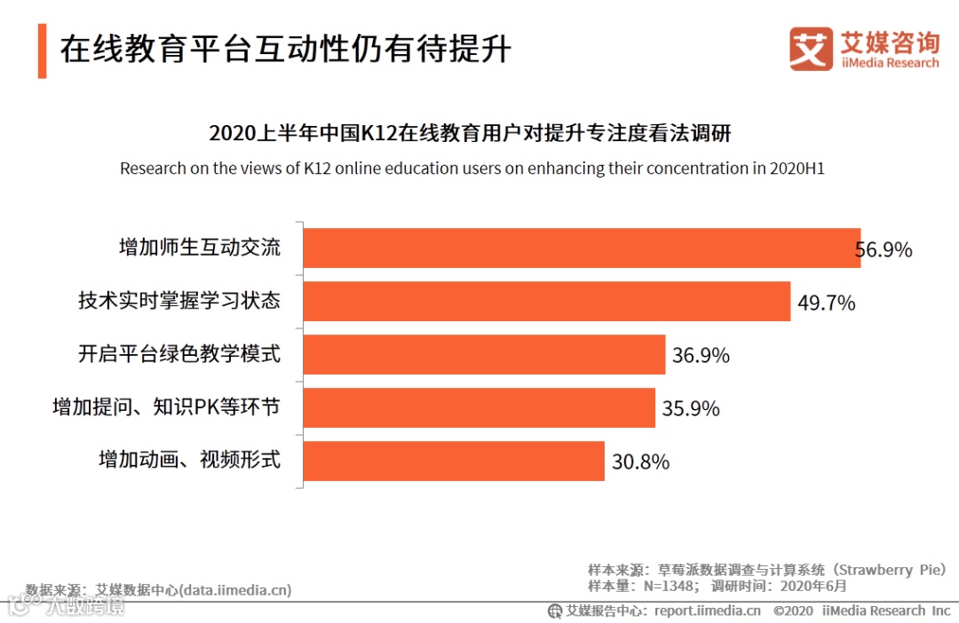 iiMedia Research(艾媒咨询)数据显示,56.9%的受访者认为增加师生互动交流可以提升K12在线平台学生学习专注度,49.7%的受访者认为技术实时掌握学习状态可以提高学生专注度。艾媒咨询分析师认为,相较于线下课堂,当前在线教育学习氛围较弱以及缺乏监督有可能造成学生专注程度不足。各平台仍需要针对在产品设计以及技术应用上作进一步升级,提高学生在线课堂的学习质量。