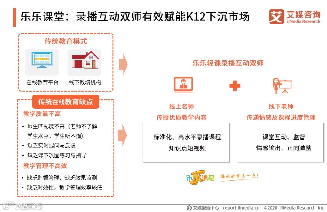乐乐课堂以优质内容为基础,极致接近线下课堂体验的“录播互动双师”产品,解决下沉市场(三四线及县乡镇)200万中小机构“缺老师、不提分”痛点。艾媒咨询分析师认为,录播双师将有望成为K12在线教育下沉的最优解之一。