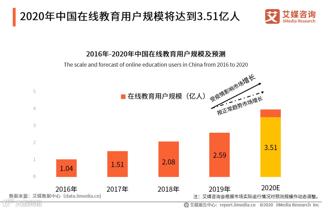 iiMedia Research(艾媒咨询)数据显示,2020年受疫情影响,在线教育需求得到激化,包括传统院校均尝试使用线上课程来保证教育计划的推进。预计2020年,中国在线教育用户规模将达到3.51亿人。艾媒咨询分析师认为,在线教育在教学时间空间的自由度、授课方式的丰富度以及个性化等方面的优势逐渐显现,市场渗透率有望持续增长。