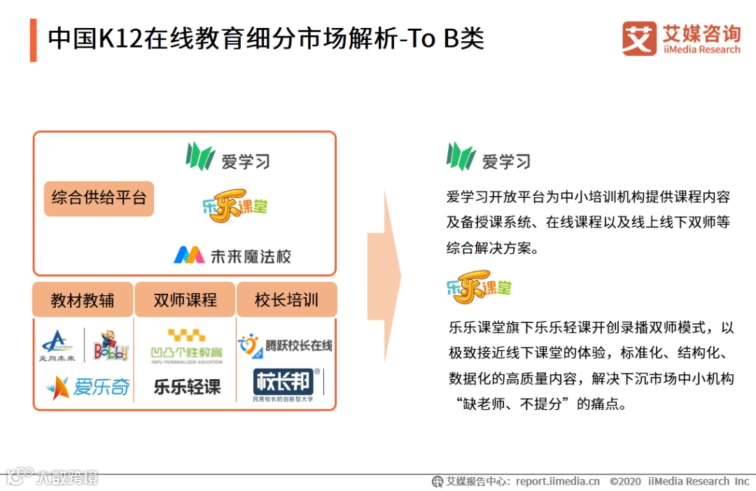 随着K12在线教育分工日益明细,To B产品和服务也已逐渐成为教育行业的基础设施。以爱学习、乐乐课堂、未来魔法校等为代表的To B综合类供给平台崛起,为各类型教培机构提供教育内容供给(教学内容供给+教研能力支持)、个性化课堂解决方案以及教育教学技术等。