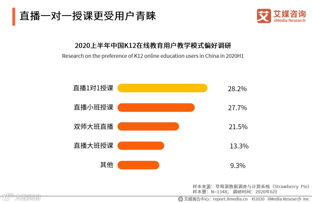 iiMedia Research(艾媒咨询)数据显示,28.2%的受访者偏好直播1V1授课,其次是直播小班授课和双师模式。艾媒咨询分析师认为,一对一以及小班授课基于在教学质量上的保障,得到了家长的认可。同时,双师模式的教学模式,在保证学生教学质量的同时,也有效降低机构平台的运营成本压力,也逐步受到学生以及平台的青睐。