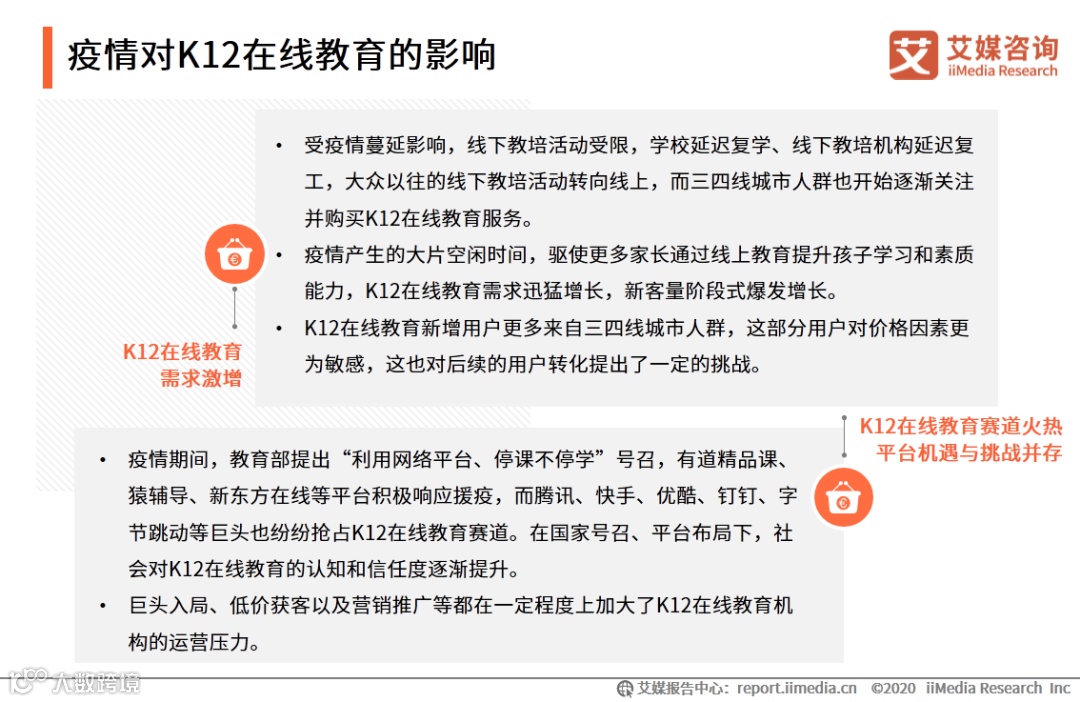 以上内容源自艾媒咨询发布《2020上半年中国K12在线教育行业研究报告》,完整版共53页;限于公众号篇幅,故仅摘部分数据和观点,如有兴趣深入,移步报告中心官网下载。