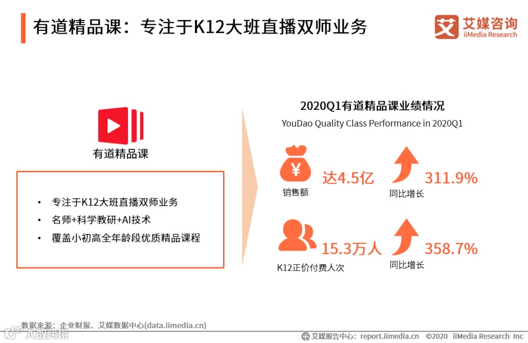 有道精品课是网易有道旗下专注于K12大班直播双师业务的在线教育品牌。有道精品课以优质名师、科学教研和AI技术为驱动,已推出了覆盖从少儿到高中全年龄段的课程,并打造了众多爆款课程IP。疫情期间,有道精品课在优质内容基础上,通过课程资源开放,以及与央视频、B站等平台合作布局等方式,有效促进K12在线教育业务的高速增长。2020年第一季度,有道精品课销售额达4.5亿,同比增长311.9%;K12正价付费人次达15.3万人,同比增长358.7% 。