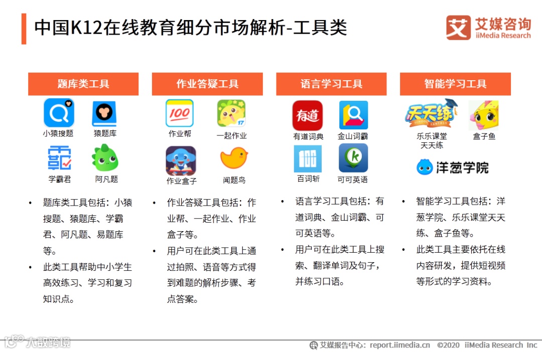 K12在线教育工具类目主要包括题库、作业答疑、语言学习以及智能学习等几大类。工具类教育APP、网站能够满足用户多样化的需求,包括学习、练习、复习和巩固知识点。
