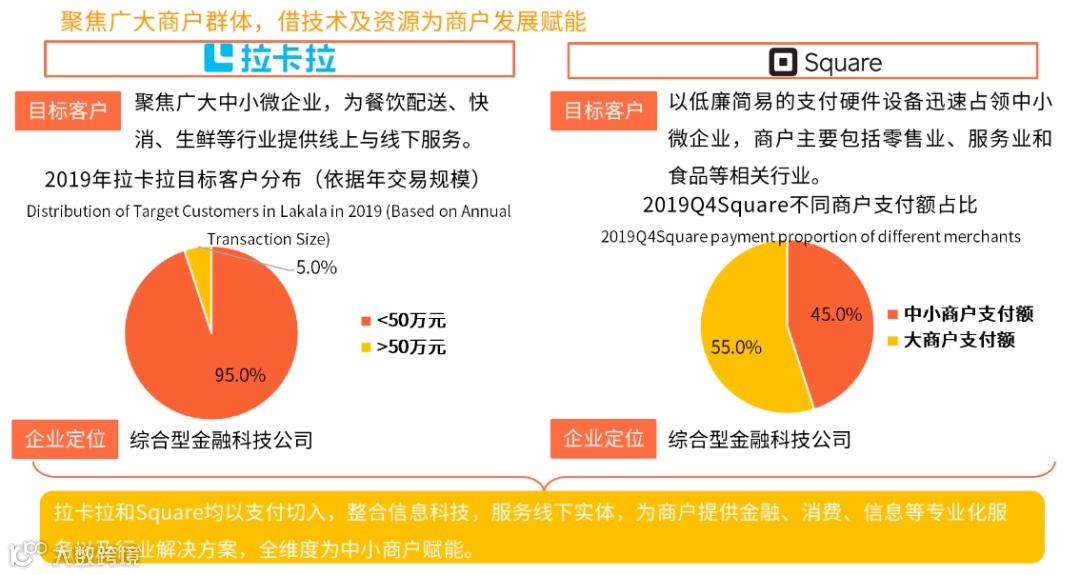 以收单侧支付机构Square和拉卡拉为例,成长路径均为深耕线下商户,提供软硬件服务的方式开辟支付市场。数据显示,2019年Square和拉卡拉的商户经营业务收入分别占总营收22%、9%,二者盈利模式均以支付业务为发展根基,向商户经营服务拓展,聚焦广大商户群体,以技术和资源为商家发展赋能,打造全链条服务生态系统。
