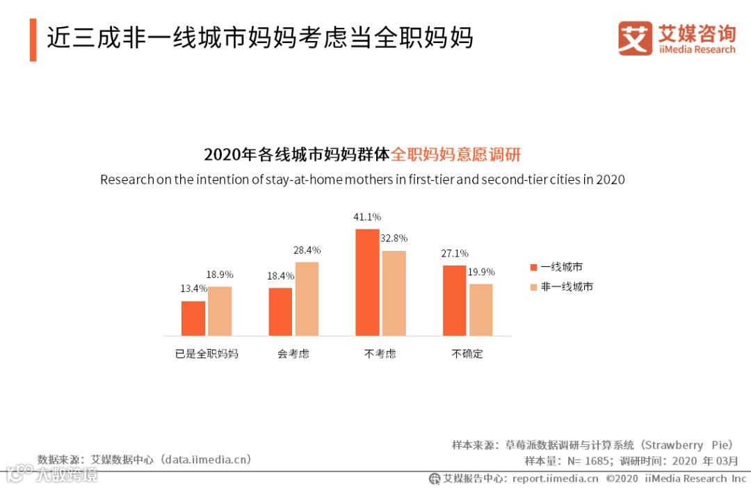 在全职妈妈问题上,一线城市妈妈群体明确表示不考虑当全职妈妈的占比为41.1%。近三成的非一线城市的妈妈人群则表示会考虑全职妈妈。整体而言,一线城市妈妈群体趋向于更加关注自身职业发展,而非一线城市的妈妈群体在职业规划上则有更大的自由度。