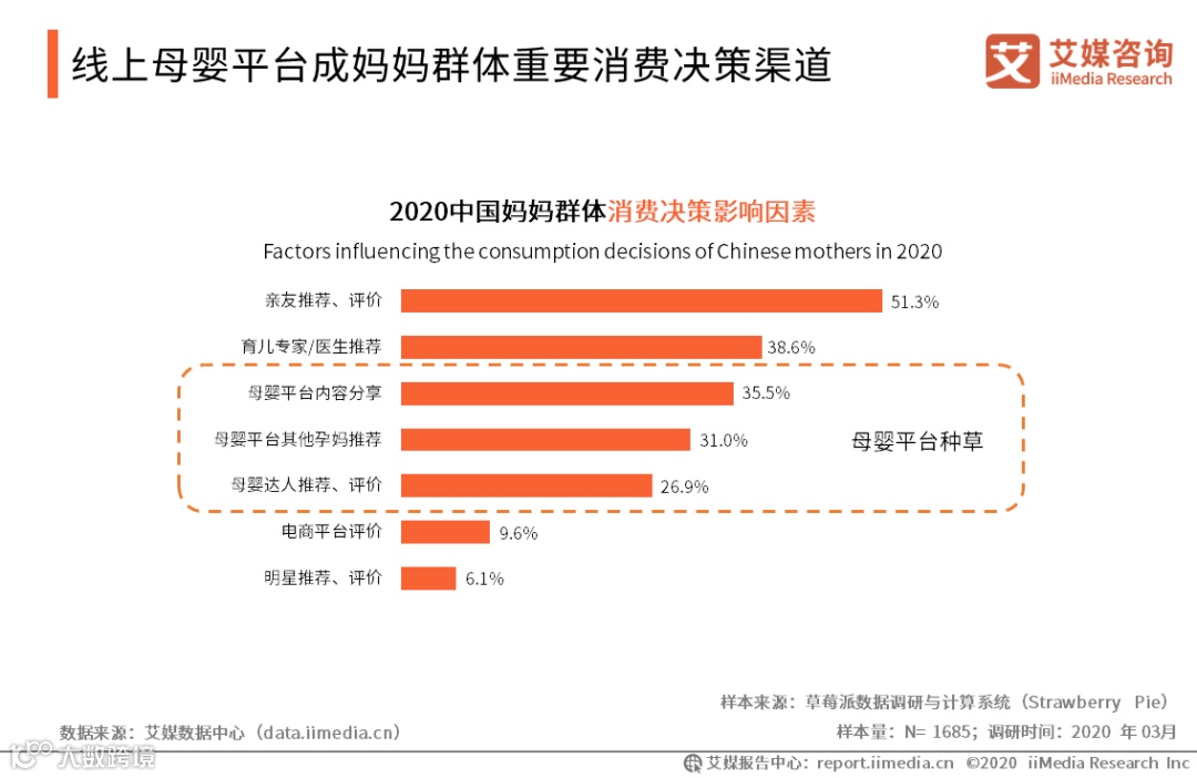 在母婴产品消费决策的影响因素调研中,除了亲友、专家推荐,线上母婴平台内容已成为妈妈群体决策的重要影响因素。数据显示,受母婴平台内的其他妈妈及KOL推荐“种草”的比例基本在三成左右。
