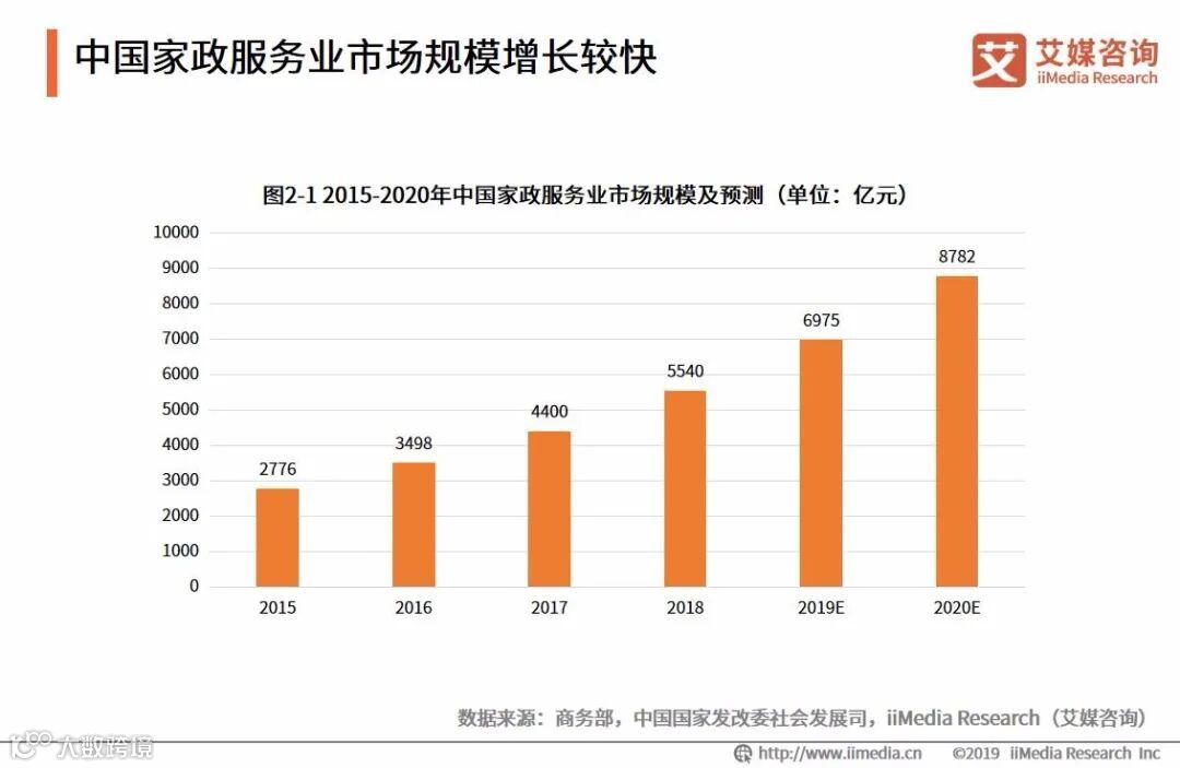 艾媒咨询数据显示,预计2020年中国家政服务业市场规模将达到8782亿元,较2017年的4400亿元基本翻了一倍。家政服务业可谓是潜力大、市场规模大、细分领域多的朝阳行业,但在这个过程中,“一嫂难求”、供需矛盾、信任问题、专业化问题等硬伤是亟待切实解决的。