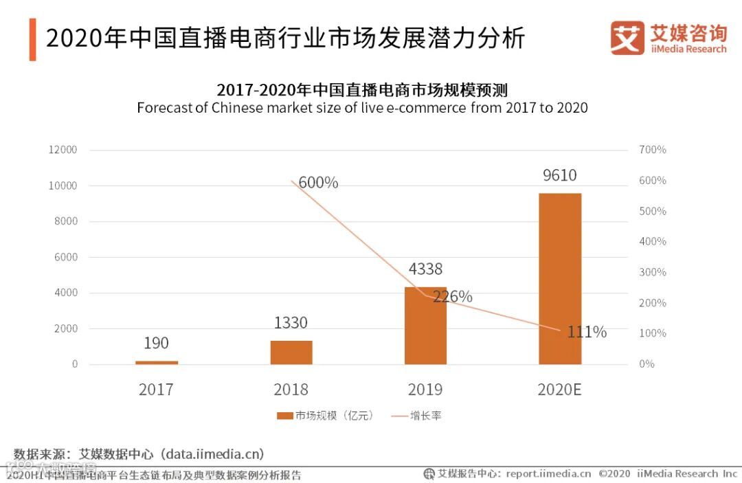 艾媒数据显示,2019年中国直播电商市场规模达到4338亿元,同比增长226%,预计到2020年将会持续以超100%的增速增长到9610亿元。