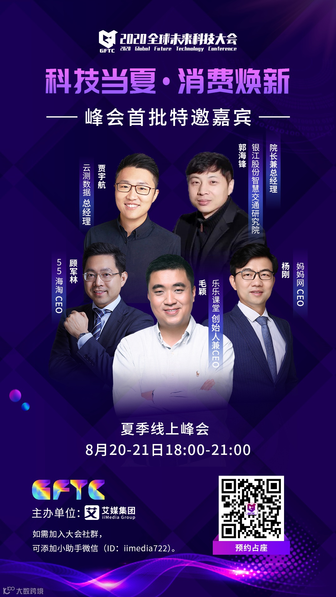 由全球知名的新经济行业数据挖掘和分析机构艾媒咨询集团打造的“2020全球未来科技大会(夏季线上峰会)将于8月20-21日在线举办,本次大会以“科技当夏·消费焕新”为主题,分设“新科技·新基建”和“新模式·新消费”两大专场,聚焦AI应用、智慧交通、智慧城市、在线教育、在线办公等前沿话题,汇聚各行业精英领袖、专家学者共同畅谈前瞻观点,探寻新经济行业新的增长动能和发展路径。