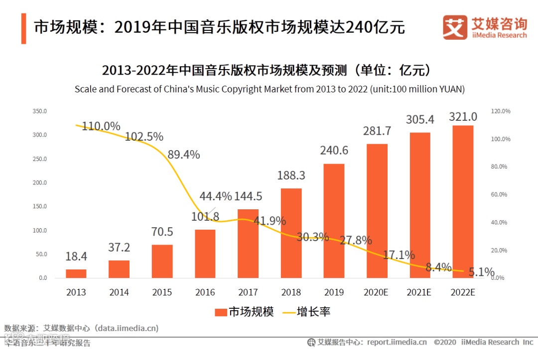 艾媒咨询数据显示,2019年中国音乐版权市场规模已经超过240亿元,预计到2020年将达281.7亿元,与前期相比,增长速度有所放缓但市场规模数额依旧高昂。