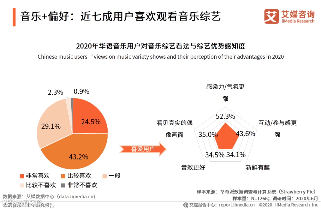 同时,也有近七成的华语音乐用户“喜欢”观看音乐综艺类节目;52.3%的用户认为音乐综艺更具感染力与氛围,43.6%的用户认为音乐综艺的参与互动感更强。而爱奇艺为用户观看音乐综艺的首选平台。