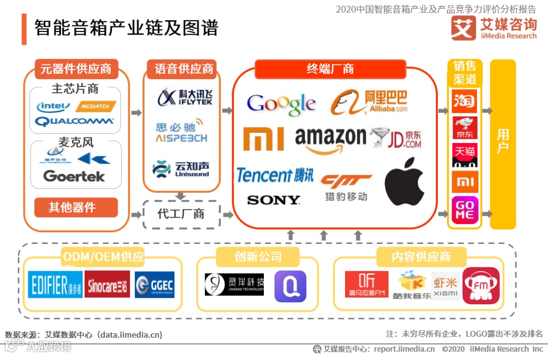 苹果、亚马逊阿里巴巴、百度、小米、谷歌、BeSound、音磅、华美兴泰、旷世音箱、乐韵瑞、crazybaby、猫王收音机、国声国学、佳禾智能、小米小爱、索尼、华为、叮咚音箱、腾讯叮当等