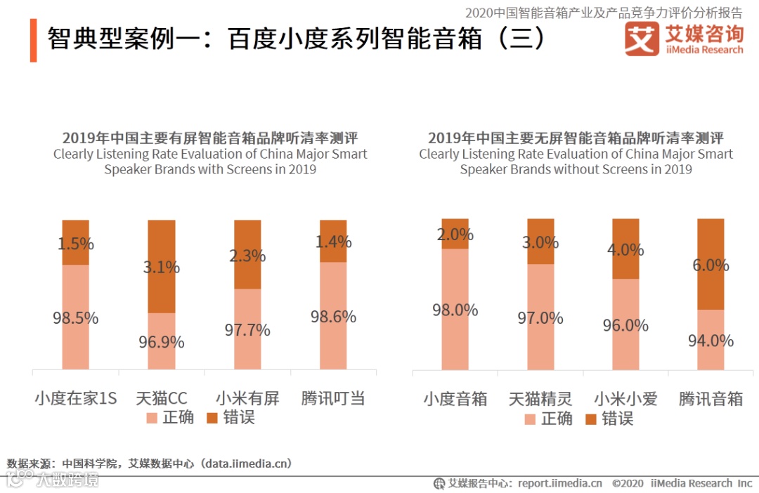 根据中国科学院测评数据显示,在对智能音箱的听清率测评上,总体四个品牌的智能音箱的听清率都达到90%以上,其中百度旗下的小度音箱排名第一,无论是有屏还是无屏系列的智能音箱听清正确率均达到98%以上。天猫、小米和腾讯旗下音箱听清正确率不相上下。