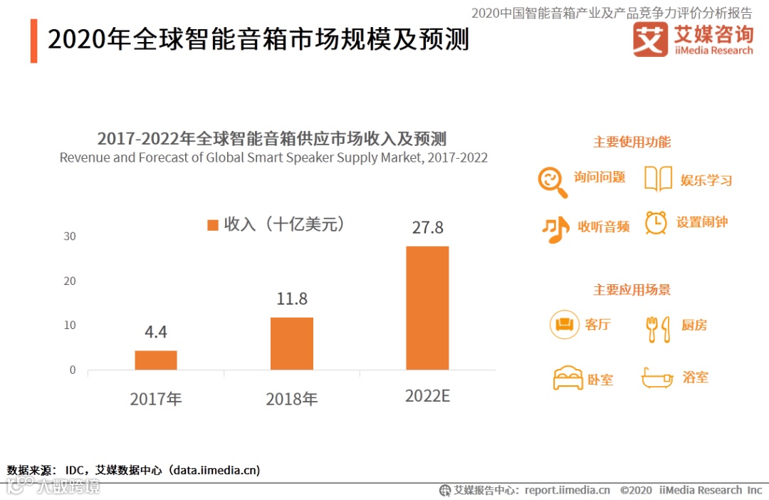 智能音箱在2020年成为热门行业,处于快速发展阶段,iiMedia Research(艾媒咨询)数据显示,预计2022年全球智能音箱供应市场收入将达到27.8十亿美元,比2018年增长135.6%。目前智能音箱主要应用场景为客厅、厨房、卧室和浴室等,主要使用的功能是询问问题、收听音频、查询天气和设置闹钟等。