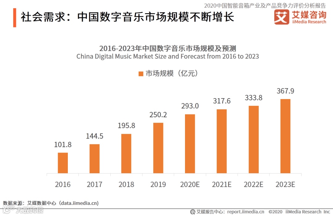 中国数字音乐产业不断增长,虽然增速放缓但总体市场规模不断扩大。iiMedia Research(艾媒咨询)数据显示,2020年数字音乐市场规模预计达到293.0亿元。艾媒咨询分析师认为,受益于数字音乐的发展,智能音箱产业的发展也得到相应推动。