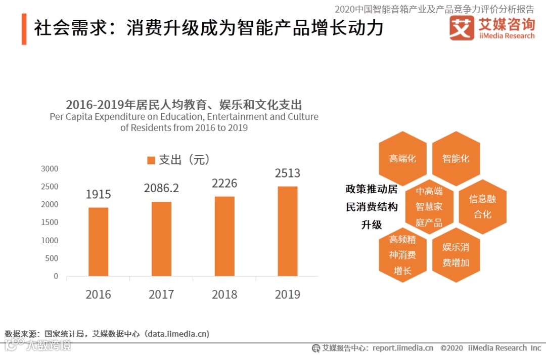 数据显示,2019年中国居民人均教育、娱乐和文化支出达到2513元,特别随着中国经济发展进入新常态,居民可支配收入不断提高,中国居民的消费结构发生变化。艾媒咨询分析师认为,政策积极鼓励引导文化产业、高频精神消费俨然成中国新经济增长点。
