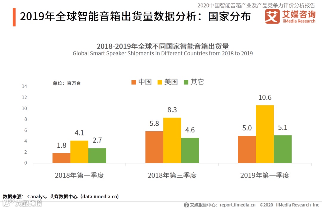 iiMedia Research(艾媒咨询)数据显示,2019年第一季全球智能音箱出货量为20.7百万台,中国出货量为5.0百万台,同比增加177.8%,美国出货量仍处于领先地位,占全球总量的51.2%。艾媒咨询分析师认为,随着国内智能音箱市场规模不断扩大,中国智能音箱出口量会进一步上升。