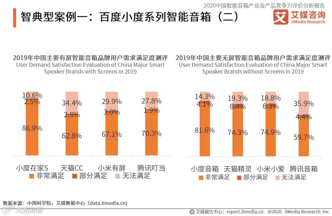 根据中国科学院测评数据显示,在对智能音箱的用户需求满足度测评上,百度旗下的小度音箱无论是有屏还是无屏系列的满足率都排名第一,超过80%用户需求通过小度音箱得到非常满足。其次是天猫和小米旗下的智能音箱产品,腾讯音箱的用户满足率最低。高的用户满足率可以提升用户体验,艾媒咨询分析师认为,良好的用户体验是百度智能音箱市场占有领先地位的原因之一。