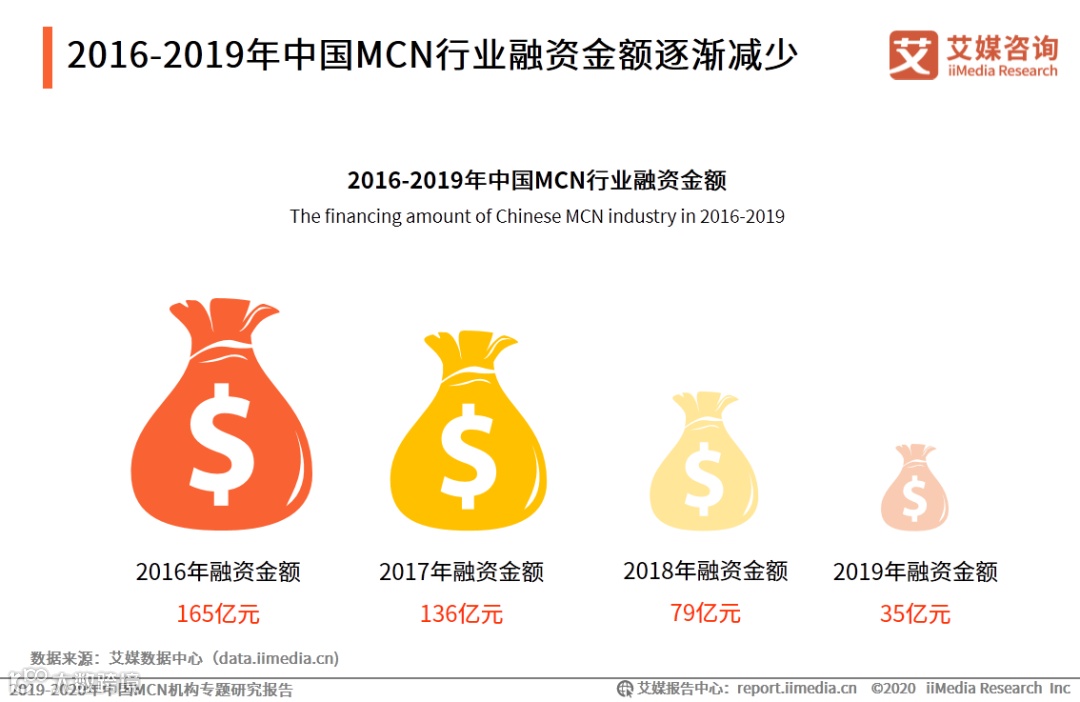 iiMedia Research(艾媒咨询)数据显示,2016年中国MCN行业融资金额为165亿元,2017年中国MCN行业融资金额为136亿元,2019年中国MCN行业融资金额减少到35亿元。艾媒咨询分析师认为,MCN机构变现能力逐渐增强,变现效益逐渐显现,融资金额和融资机会逐渐减少。