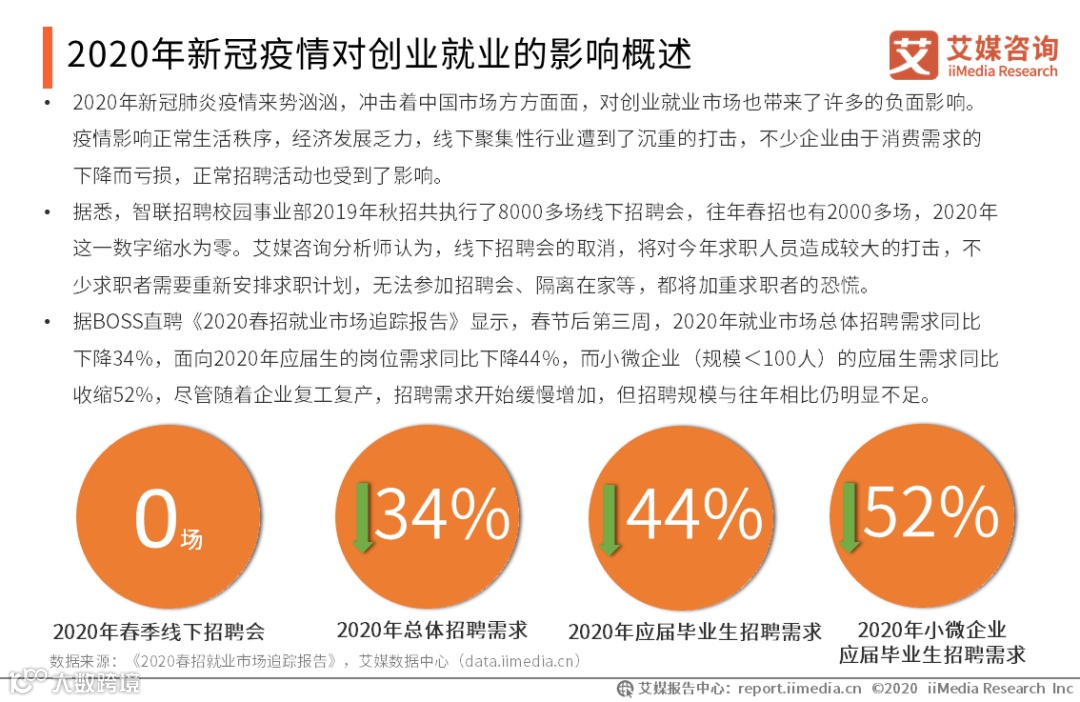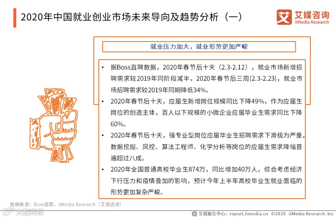 以上内容源自艾媒咨询发布《2020年中国就业创业市场现状与趋势发展分析报告》,完整版共102页;限于公众号篇幅,故仅摘部分数据和观点,如有兴趣深入,移步报告中心官网下载。