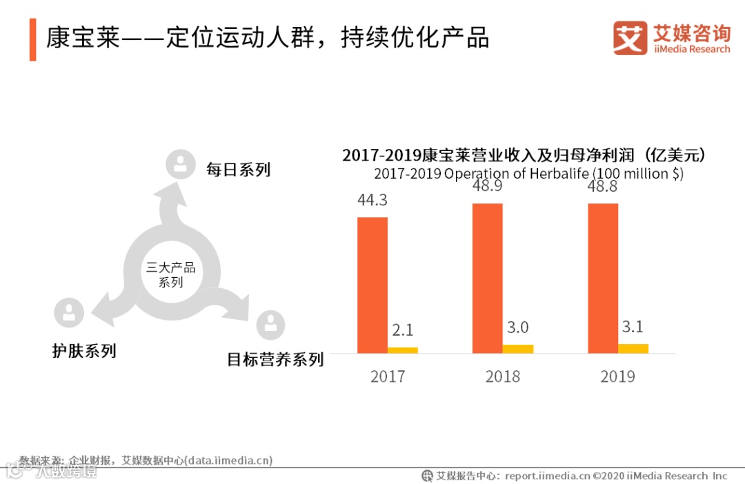 康宝莱创立于1980年,是一家以运动人群为主要目标的保健品直销企业,通过各类产品满足人们对体重管理、运动营养、能量补充等多方面需求。2019年受中国保健品监管影响,康宝莱前三季度业绩出现下滑。艾媒咨询分析师认为,相较于其他细分市场,体重管理领域市场相对集中,康宝莱凭借入局较早、精准定位、产品优化等优势迅速占领体重管理市场,并形成一家独大的格局。但减肥产品存在一定的后向选择问题,随着健康意识的不断提高,消费者也更加注重对自身营养的摄入控制,而非肥胖后再进行药物减肥,这对体重管理市场的后期发展会有一定抑制作用。