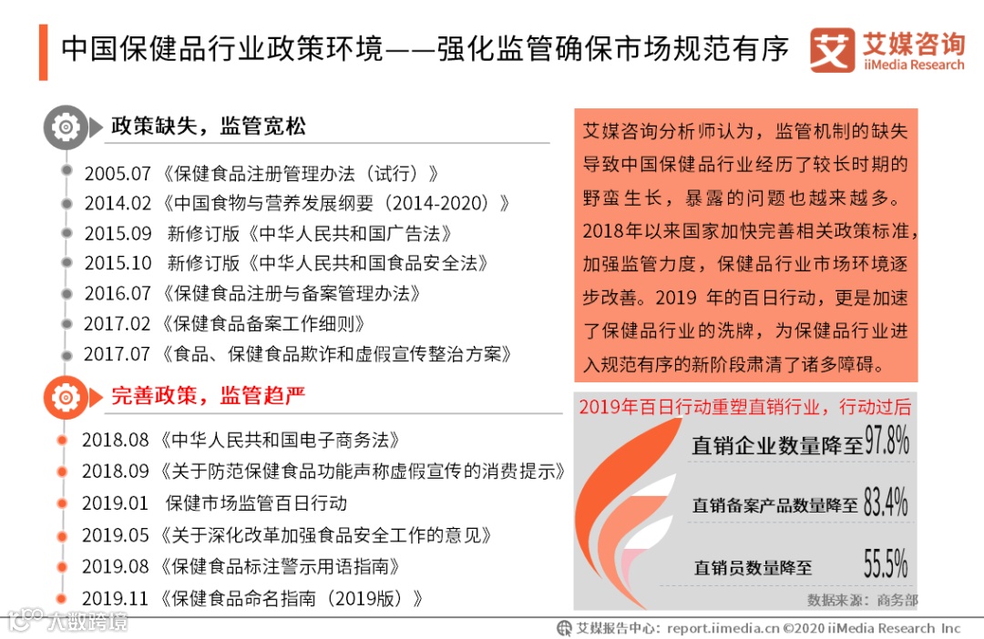 艾媒咨询分析师认为,“权健事件”的爆发倒逼保健品行业监管升级,相关部门收紧牌照发放,加大审查力度,行业整体监管趋严将成为常态化。监管趋严虽然有利于行业长期健康发展,但短期内企业经营受到的限制增加,面临的监管风险也会加剧。对此,企业需要加强内部管理,重视外部舆情,尽早识别和排除问题,以提升风险规避和应对的能力。