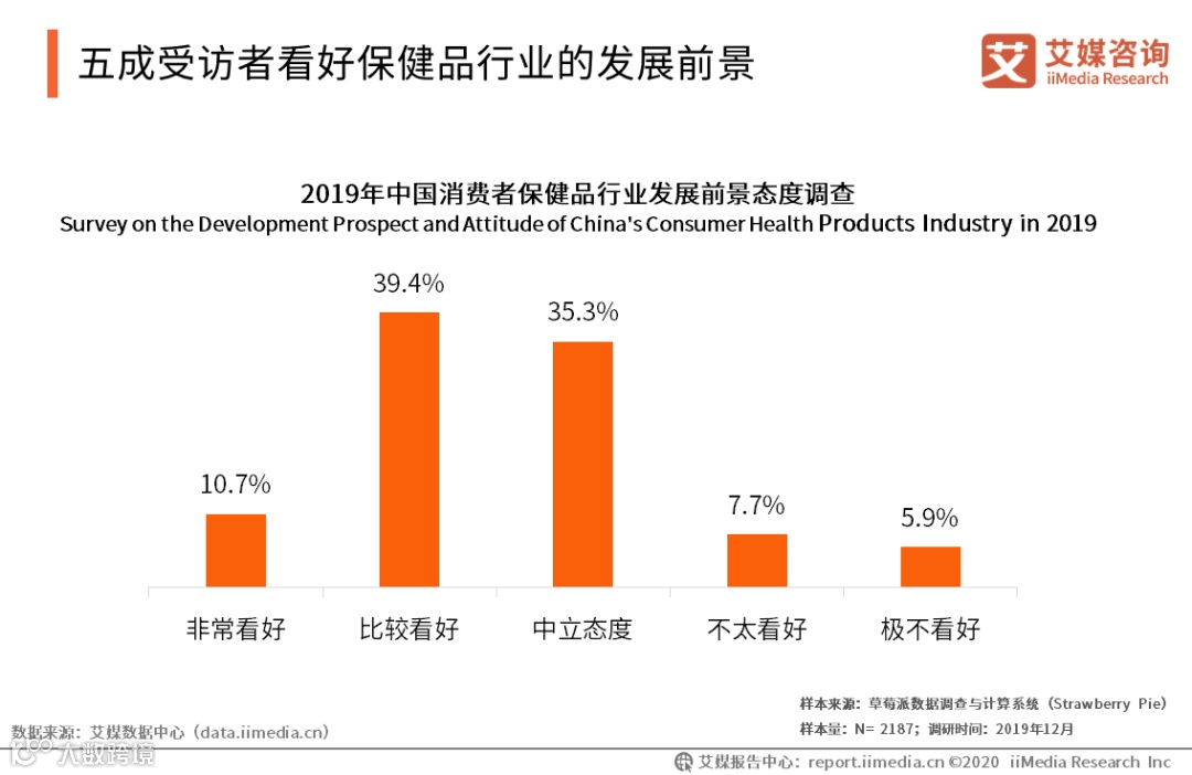 iiMedia Research(艾媒咨询)数据显示,10.7%的受访者非常看好保健品行业的发展前景,比较看好的占39.4%,对保健品行业发展前景持悲观态度的消费者占13.6%。艾媒咨询分析师认为,一方面,随着老龄化趋势加剧,年轻消费者健康意识提升,保健品的刚需属性逐渐加强;另一方面,在健康中国的战略背景下,政府监管部门、相关企业都会加大力度改善行业供给现状,保健品行业有望长期向好发展。