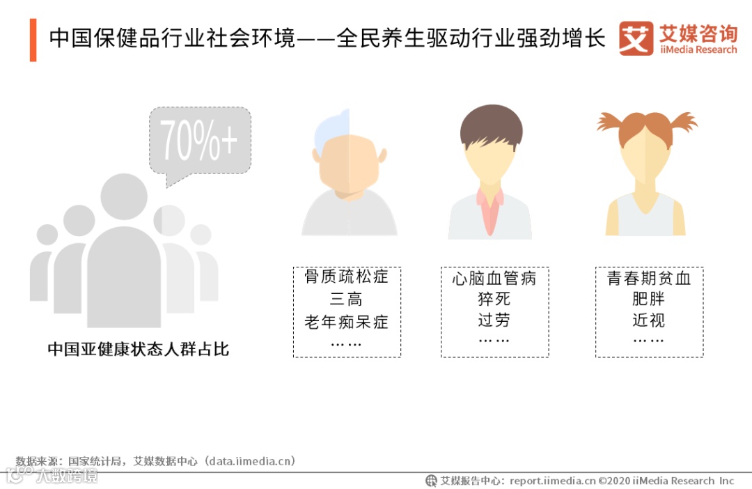 中国正步入老龄化社会,数据显示,2018年中国60岁以上人口达2.49亿,占总人口的17.9%。此外,工作生活压力大、作息饮食不规律等问题进一步加剧了中国居民亚健康状态,导致疾病年轻化趋势愈发明显。艾媒咨询分析师认为,老、中、青三代人的面临的健康问题意味着养生保健并非是“银发一族”的专属需求。随着社会对健康的重视程度加深,未来将会有越来越多的人群加入到养生保健队伍。在全民养生的风潮下,保健品行业将会保持强劲的增长。