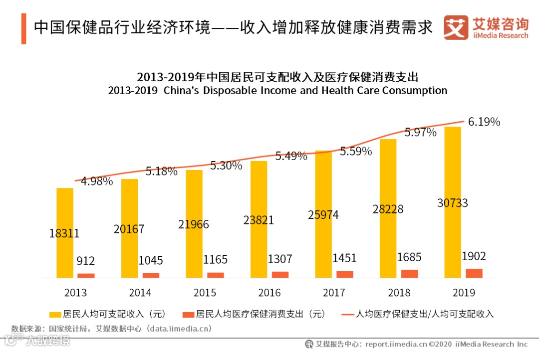 数据显示,中国居民可支配收入持续增长,但医疗保健消费支出水平仍处在较低水平,2019年居民人均医疗保健消费支出为1902元,占人均可支配收入的6.19%。艾媒咨询分析师认为,收入水平的增加以及国民健康意识的增强,将会持续刺激居民释放健康消费需求,医疗保健消费支出占比有望大幅提升,凸显出保健品市场的巨大发展潜力。