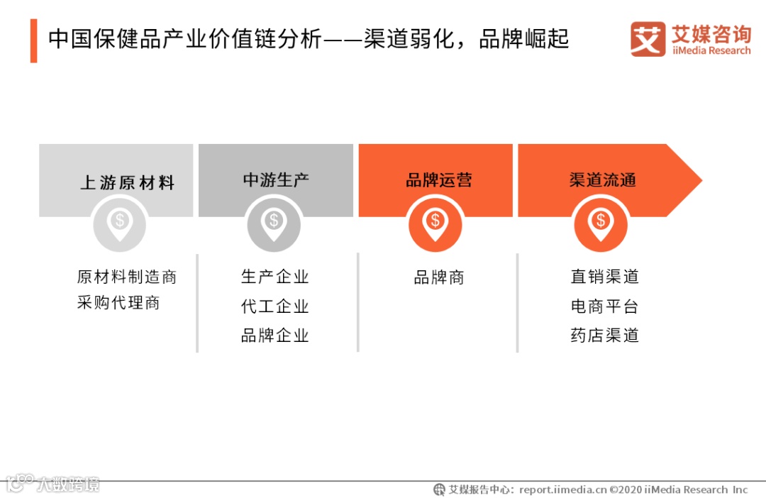 中国保健品产业链主要包括原料、生产、运营、流通四个环节。过去由于市场健康意识薄弱且信息不对称等问题,直接联通消费者的渠道商成为影响市场发展的最关键因素,也因此在产业链享有较强的话语权,从而成为产业链核心环节。艾媒咨询分析师认为,随着行业监管趋严,品牌方因资质壁垒更具稀缺性;与此同时,信息技术的发展让线上渠道加速扩张,挤占了传统渠道的份额;综合比较,品牌商在产业链的价值趋于上升,而渠道商的价值呈现下降。为了获取更多的价值分配,一些头部品牌商开始自建渠道或与渠道商进行深度合作。