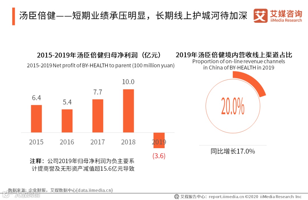 2019年医保政策改革以及保健品行业监管趋严给以药店为主要渠道的汤臣倍健带来较大影响。艾媒咨询分析师认为,医保政策收紧将是长期趋势,这将促使汤臣倍健加速线上转型,但当前汤臣倍健在线上渠道并未建立较深的护城河,随着线上获客成本的攀升,以及其他保健品品牌全渠道发展,汤臣倍健将面临较大的竞争压力。
