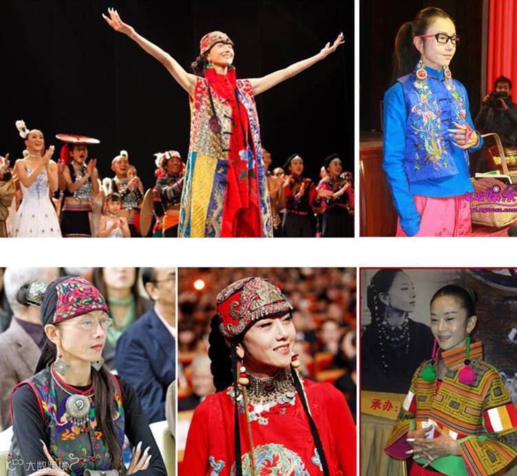 一说到民族风不得不让人联想到舞蹈家杨丽萍。她以曼妙的身姿、灵动的舞蹈,惟妙惟肖地模仿少数民族地区的动物和自然,演绎着美轮美奂的舞蹈《雀之灵》,她本人也因此被称做孔雀公主。杨丽萍对少数民族的传统有着深厚的感情,这也深深地影响着她的穿衣风格。