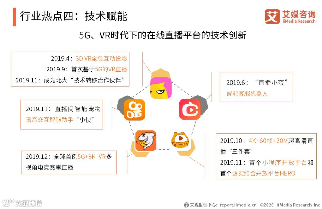 在线直播平台将继续借助技术为其赋能,通过布局5G、VR、AI等技术获取差异化优势并寻求平台留存用户、提高收益的突破点。多元化实时交互功能加速发展,在线直播平台通过技术实现布局更多业务的可能。