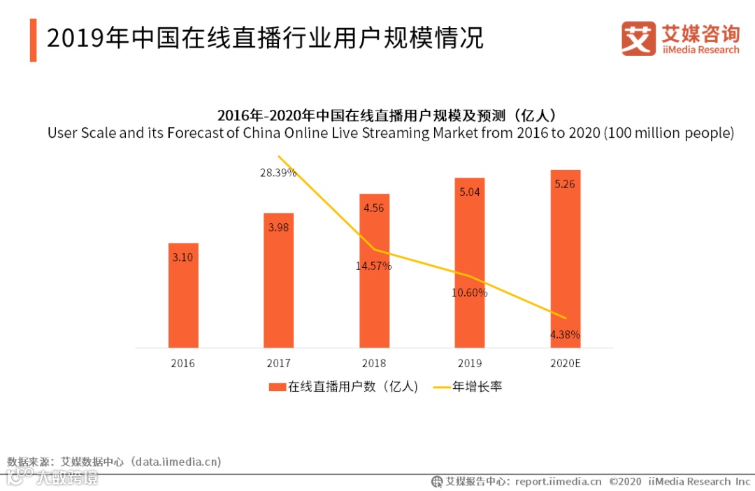 iiMedia Research(艾媒咨询)数据显示,2019年中国在线直播行业用户规模达5.04亿人,增长率为10.6%;2020年用户规模预计达5.26亿人。艾媒咨询分析师认为,中国在线直播行业将继续保持稳健发展,未来行业将进入精细化、专业化运营阶段。
