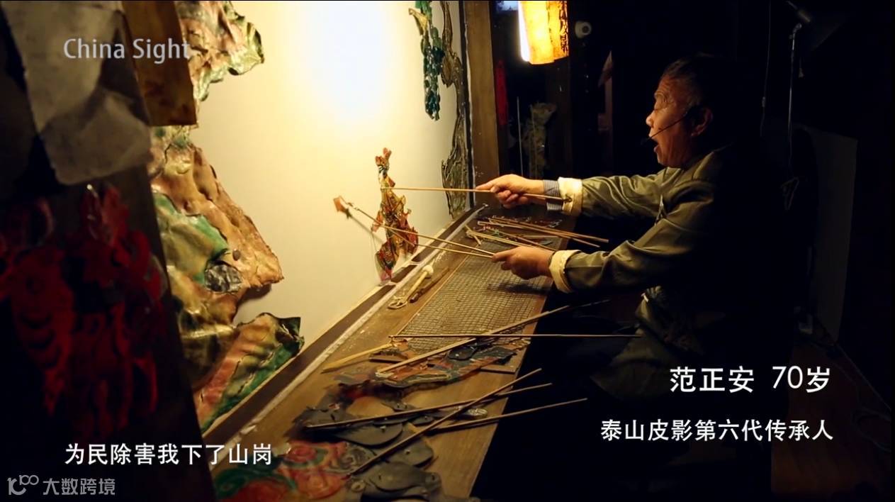 “来者何人?通上名来,泰山上下来石敢当,为民除害我下了山……”一阵锣鼓齐鸣后,害人无数的“恶狼妖”死在了“石敢当”的红缨枪下。而影幕后面,范正安挥舞着皮影刀具,左脚踩鼓,右脚敲锣,口中念唱,双手并用挥舞皮影,古老的皮影活灵活现的呈现在幕布前。脑中想着词儿,口中唱着曲儿,手里舞着人儿,脚下踩着槌儿,把全身都调动起来,一个人身兼数职独自完成一整台戏的演出,这就是泰安皮影的特色,又称“十不闲”。据文化部统计,目前皮影“十不闲”绝技在中国就只有泰山皮影的第六代传承人——范正安一人完整的继承和保留下来。