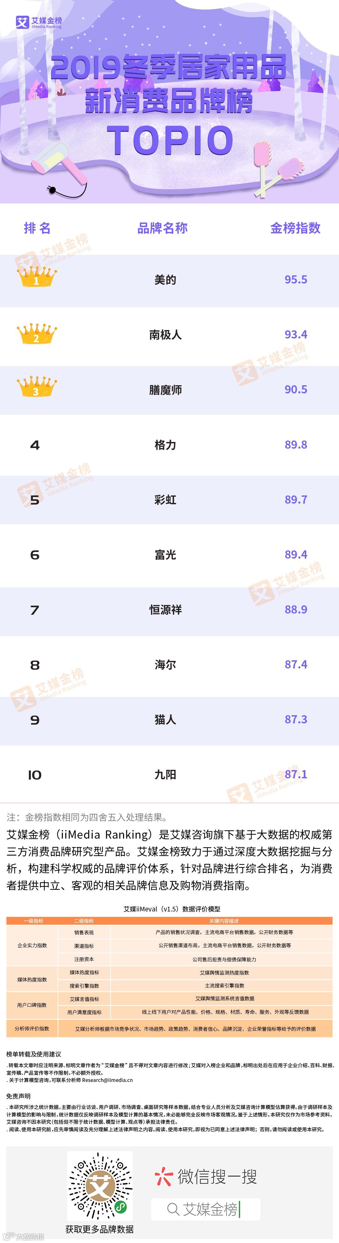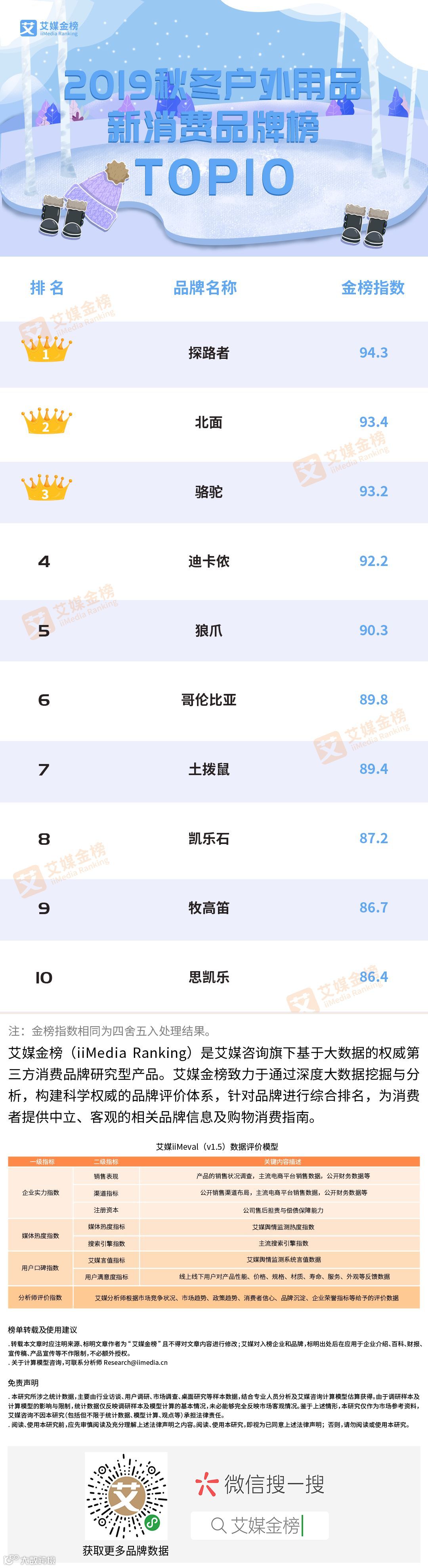 消费者的需求总是跟着季节走的,眼下伴随着冬天的步伐,从衣物、家居用品到护肤用品,都需要一次“大变身”。日前,艾媒金榜(iiMedia Ranking)基于艾媒大数据监测,综合品牌实力、发展范围、网络口碑、线上关注热度、分析师评分等计算金榜指数,展示出户外用品、居家用品、护肤品部分秋冬用品新消费品牌名单。