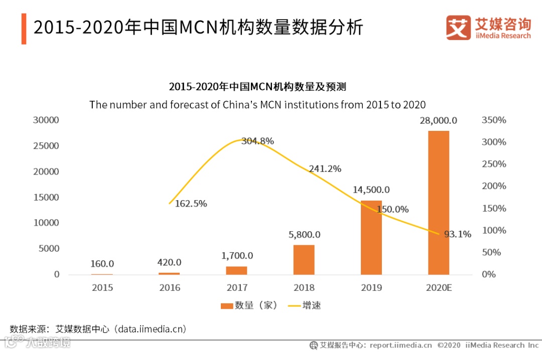 作为内容产业的新兴环节,中国MCN产业自2017年出现了爆发式增长,机构数量从数百家量级猛涨到上万家量级,预计到2020年,中国MCN机构数量将达到28000家。