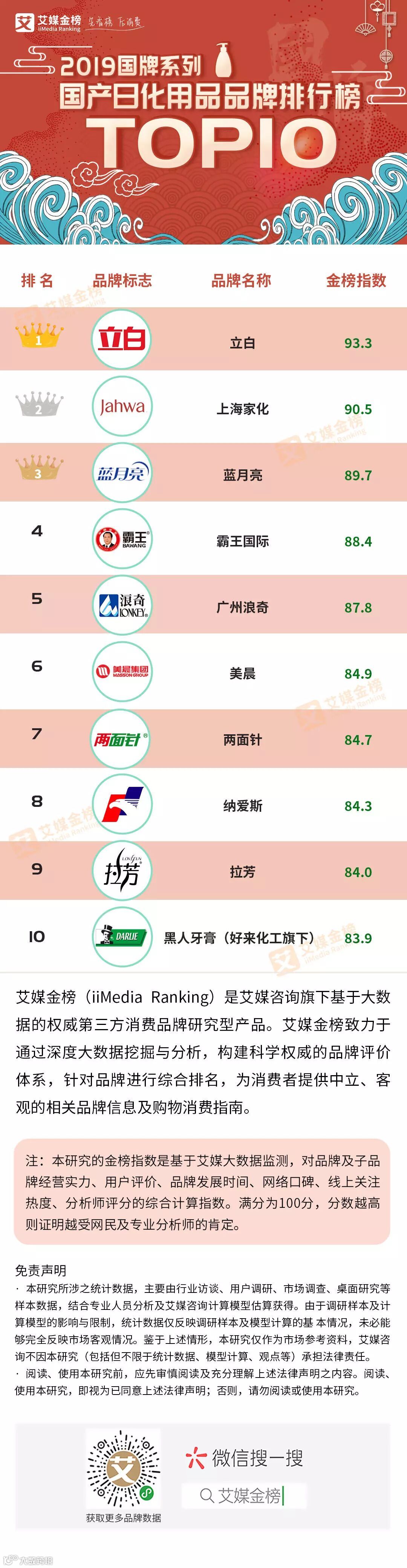 艾媒金榜(iiMedia Ranking)发布了2019国牌系列第五批榜单,中国日化品牌排行榜top10,立白、上海家化、蓝月亮、霸王国际、广州浪奇、美晨等国产日化品牌凭借综合实力成功上榜。