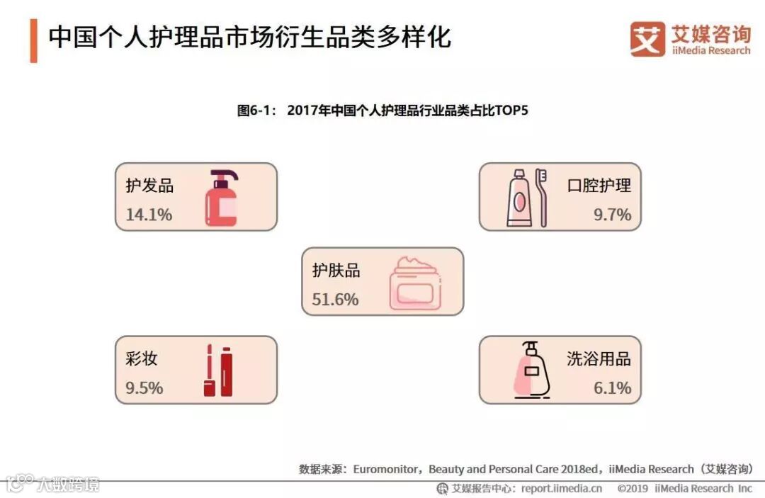 从中国个人护理品市场的构成情况来看,护肤品、护发品、口腔护理、彩妆和洗浴用品是前五大品类,贡献了91.0%的市场销售额。随着消费者卫生习惯改善及大众日化产品普及,护发、沐浴和口腔护理产品等基础日化产品发展已进入稳定期,未来竞争会更多集中在市场份额的争夺和对原有领导型品牌的挑战。