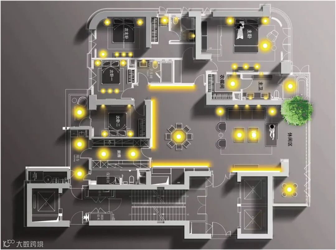 例如:主人下班回家后,可通过手机、语音开启家中的灯光,玄关灯自动亮起,客厅的射灯,灯带在3秒后缓缓亮起。