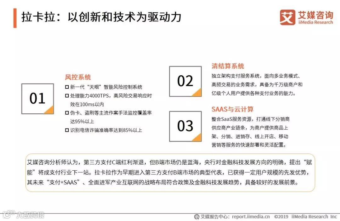 拉卡拉服务中小商户的优势,在于其以创新和技术为驱动力,业务全面基于科技、云和人工智能的特点。拉卡拉建立了基于大数据、实时云计算和分布式计算的风控系统,具备了实时风控、准实时风控、批量风控的三层能力;利用互联网和SaaS服务,整合信息科技,提升用户粘性及服务深度;深入大数据、云计算、人工智能领域以完善服务供给,降低服务成本,优化客户服务,提升金融服务质量与效率,使科技创新成果更好地惠及线下中小商户长尾群体。