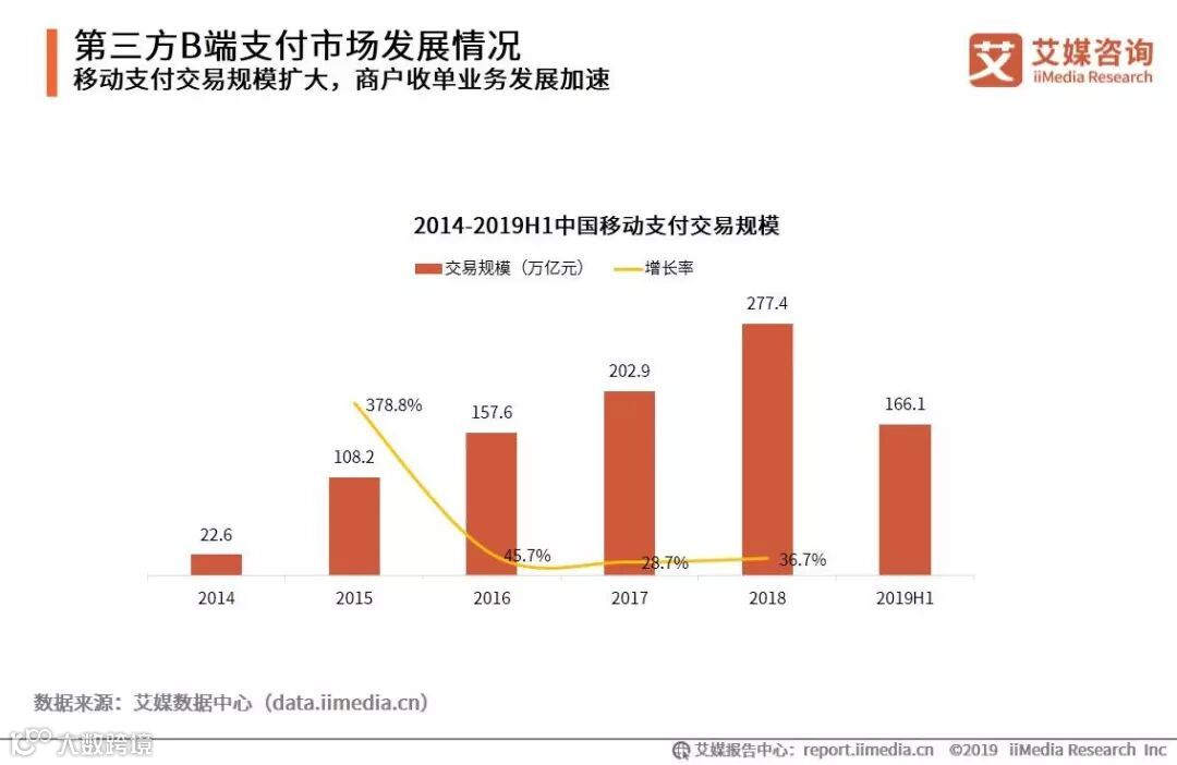 iiMedia Research(艾媒咨询)数据显示,中国移动支付交易规模逐年扩大,2019年上半年交易规模已达到166.1万亿元。艾媒咨询分析师认为,移动支付的普及推动了线下非现金交易业务的快速发展,从而促进商户收单业务进一步扩大,在C端支付市场几乎被支付宝和微信支付瓜分的情况下,B端商户收单业务市场仍有待进一步被激发。