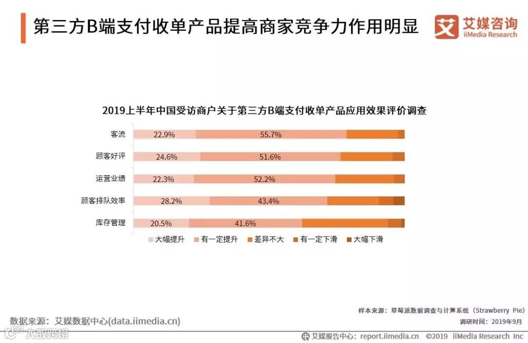 iiMedia Research(艾媒咨询)调查数据显示,第三方B端支付收单产品的应用,对商户总体竞争力提升的作用十分明显。其中,产品接入对商家客流和顾客体验作用最为明显,分别有78.6%和76.2%的受访商户表示接入第三方B端支付收单产品后,客流和顾客好评有所提升。而表示产品接入后运营业绩、顾客排队效率和库存管理方面有所提升的受访商户占比也均达到六成以上。