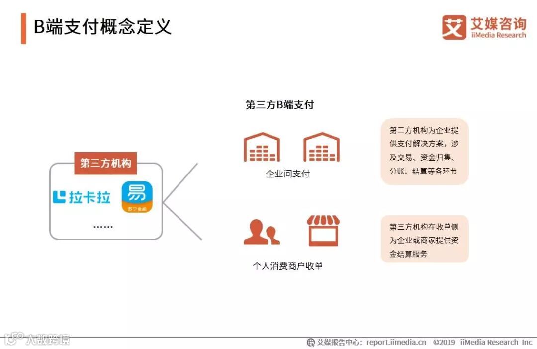 B端支付,指支付过程中涉及到企业或中小微商家的部分。其中包括企业间支付过程中的交易和清结算,以及个人消费者支付过程中对商家账户的清结算。第三方B端支付则指具备经济实力和信誉保障的持证独立第三方机构,向企业及中小微商家提供支付解决方案。