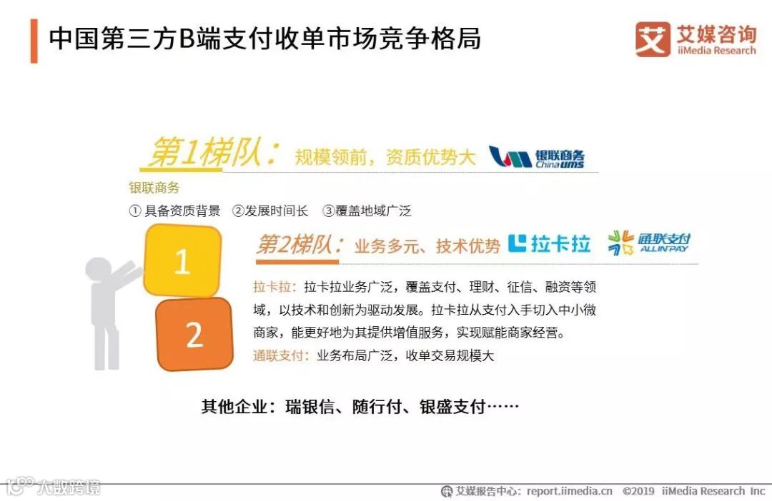 iiMedia Research(艾媒咨询)研究成果显示,目前中国第三方B端支付市场中,第一梯队企业为银联商务,其凭借银联资质背景,在全国范围发展,有较强的竞争力。而第二梯队企业拉卡拉、通联支付对比银联商务和其他梯队企业,具有业务多元化的优势,其中拉卡拉注重技术赋能产品,为商户提供更好的终端使用体验和延伸金融服务,收单交易规模常年处于行业前列。