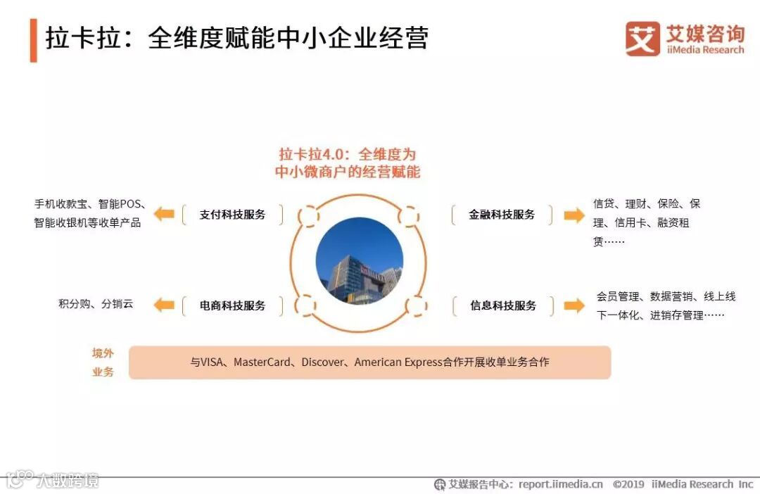 目前拉卡拉进入战略4.0时代,通过支付科技、金融科技、电商科技和信息科技等服务,全维度为线下中小企业经营赋能。拉卡拉支付科技服务核心在于解决中小商户高频小额收款问题,自主开发并推出多渠道创新收单产品(如智能POS、收钱宝盒等),配合高效的清结算系统,针对中小微商户高频小额、支付方式多样的收款特点,为商户提供“全场景、全支付”的收单服务。在战略4.0时代,拉卡拉还为商户提供信贷、理财、分销、会员管理等经营所需的各类增值服务,全方位帮助商户实现经营升级。同时积极布局海外业务,解决中小跨境电商商户跨境收付款难题。