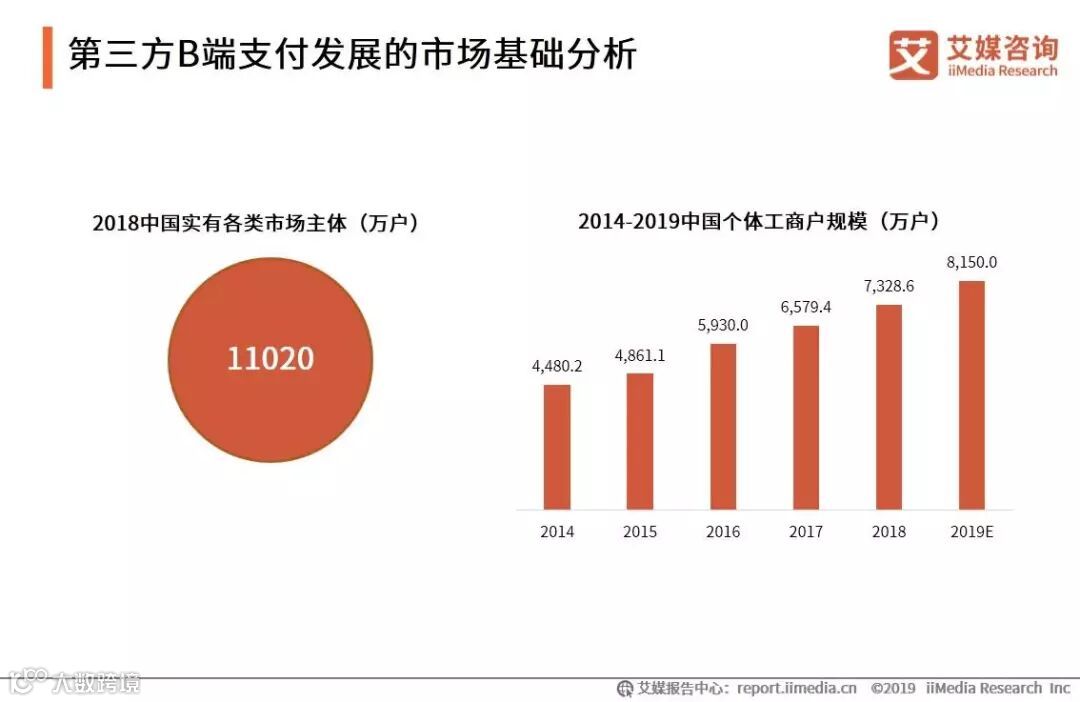 iiMedia Research(艾媒咨询)数据显示,2018年中国实有各类市场主体11020万户,其中个体工商户规模超过7000万户。艾媒咨询分析师认为,中国存在庞大的市场主体,而中小微企业主体更是市场的重要组成部分。随着移动支付逐渐普及,商户对于B端支付服务的使用也在提升,同时也衍生了如营销、财务管理等金融生态服务需求,由此催生出广阔的B端支付服务市场。