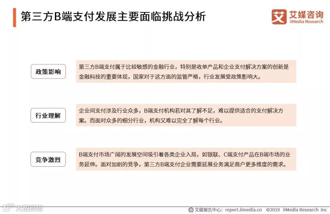 B端支付市场存在良好发展基础的同时,也面临着众多挑战。作为金融行业,特别是金融创新的重要表现,第三方B端支付受政策影响大。另一方面,B端支付涉及企业来自各行各业,支付机构难以对每个行业都有深入了解,因此业务难以实现大规模的覆盖。而个人支付商家收单业务虽然市场巨大,但银联、C端支付巨头企业等入局,对第三方B端支付平台造成巨大的竞争压力。面对激烈的市场竞争,第三方B端支付企业需要延展服务链条,为商户提供更多维度的服务需求,而这对于企业的综合实力要求较高。