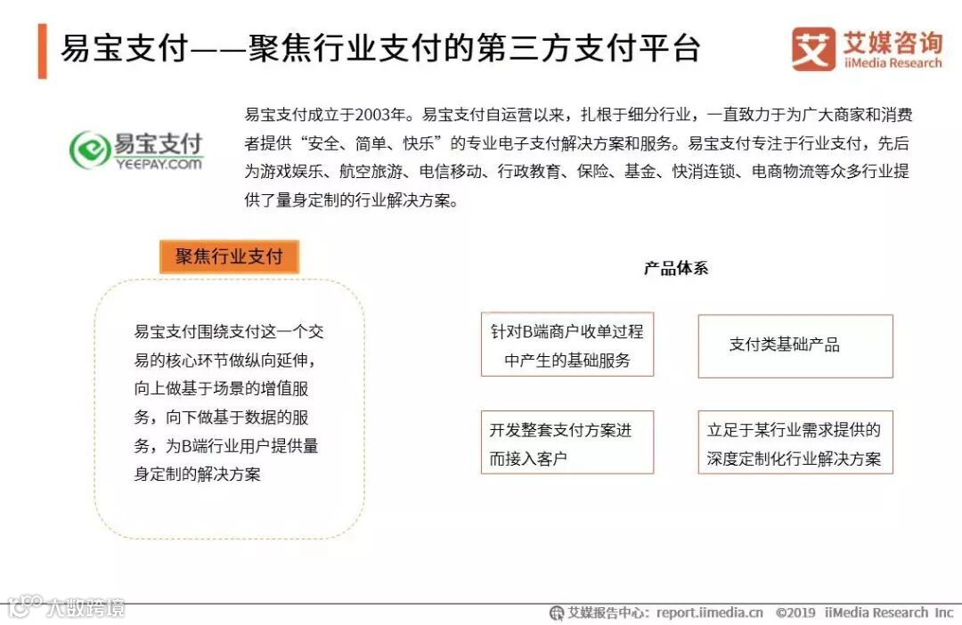 易宝支付扎根于企业级市场,易宝支付聚焦行业B端场景和产业链条,深入提供支付和相关交易服务,在交易大规模并发,交易安全和基于数据的增值服务方面,积累起自身的核心能力。开拓路航旅事业部、新零售行业线、行政行业线等行业方案。易宝支付在2014—2018年间,因合约问题先后被央行处罚5次,在后续经营中,随着监管趋向更为严格,对于第三方支付机构而言,合规和风控方面的自我要求需要提高。